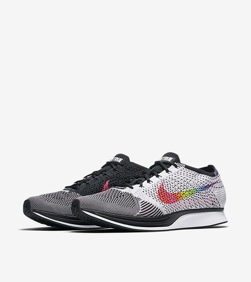 Using vacuum-printed sublimation to achieve maximum brightness and a smooth, HD gradient, Nike designers achieved the first-ever eight-color, rainbow Swoosh design on the lateral side of the black and white Flyknit Racer. The rainbow gradient references the original eight-color Pride flag. The medial-side Swoosh design is pink, referencing the colour’s widespread use in the LGBTQ community. |