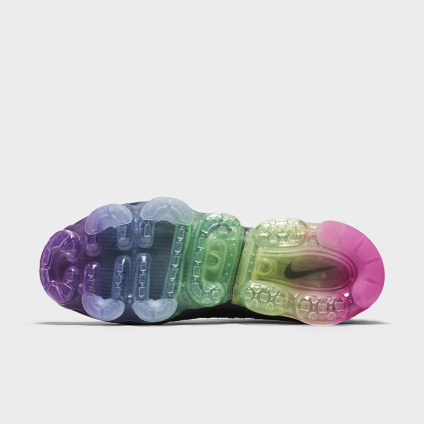 The Nike Air VaporMax has the first-ever rainbow-colored VaporMax Air unit, maintaining the eight colours of the original 1978 Pride flag beneath a dark violet Flyknit upper. Each VaporMax Air unit is created at the Nike Air Manufacturing Innovation facility in Oregon, where Nike designers and manufacturers came together to create an entirely new process for dyeing an air bag with more than two colors for the first time. |