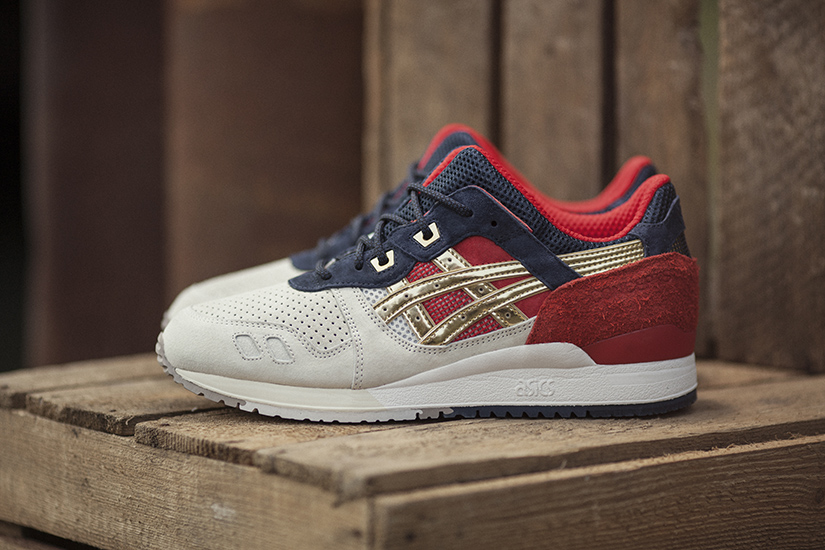 Concepts Asics Gel Lyte 3 inspired by the Boston Tea Party. The sneakers are clearly patriotic in nature. Red Coats (British) , White and Blue Coats (Patriots) with alternating silver and gold Asics branding. |