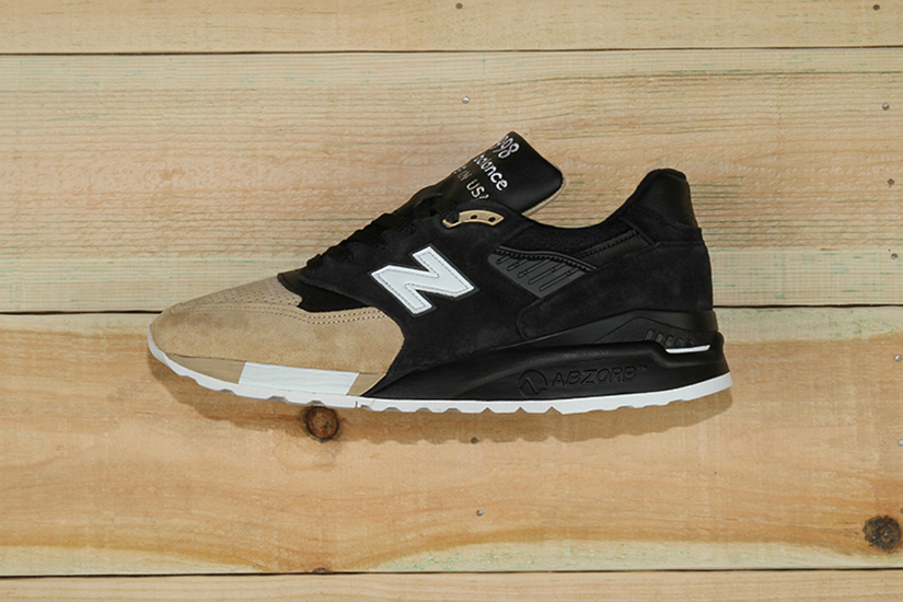 Michigan based PREMIER and New Balance work together on the USA made 998 to present the 998PRMR. Inspired by Michigans rich automotive history the shoe is a glorious blend of black and tan suedes with white call outs on the outsole and two piece leather N detail. Perforated suede wraps the toe box while black leather accents sit on the mid foot, tongue and heel. Bespoke details appear in the form of custom PREMIER footbeds, a metal PRMR tag and a NB ignition key tag.